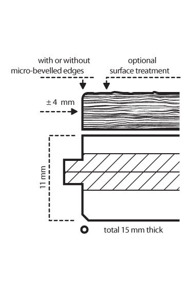 Engineered hardwood floorboards are made by combining several layers of wood into one durable component. Each board features a 4 mm oak top layer (or 6 mm with the 20 mm boards) in thickness. This top layer is glued to an 11 mm (or 14 mm thick for the 20 mm boards) birch wood multiplex base layer. This results in a stable and durable floorboard with a total thickness of 15 mm or 20 mm. A major advantage of this stable product? It’s easily combined with floor heating!